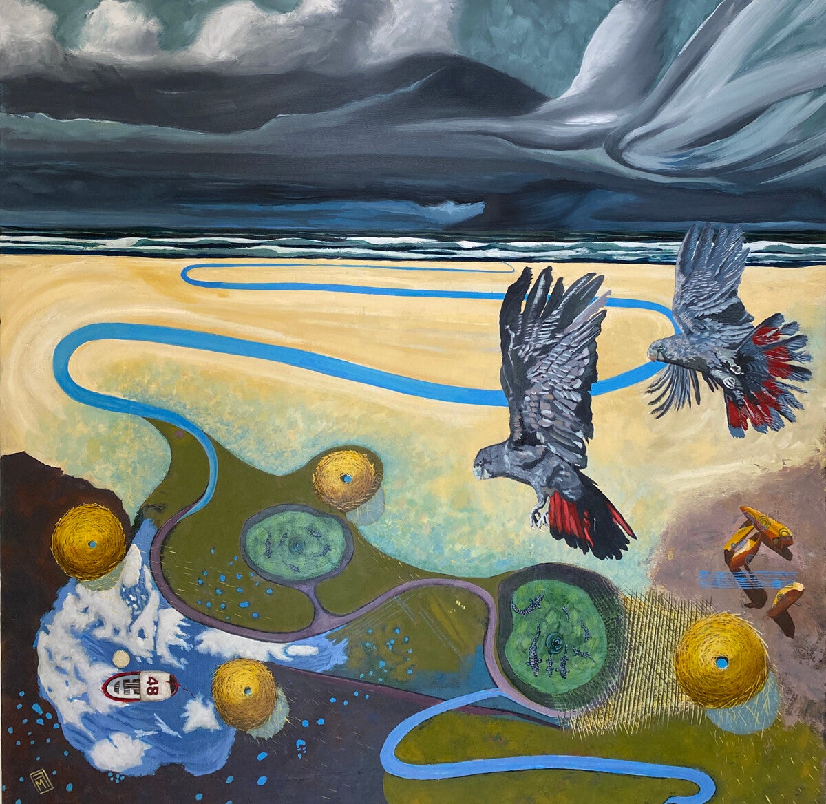 The symbolic language within the work is one I have been developing across many years of practice. Each element carries personal significance, yet is deliberately open-ended, allowing the viewer to enter the narrative on their own terms. The straw bales that dominate the composition originate from my childhood in England, during a period marked by innocence, physical freedom, and familial closeness.