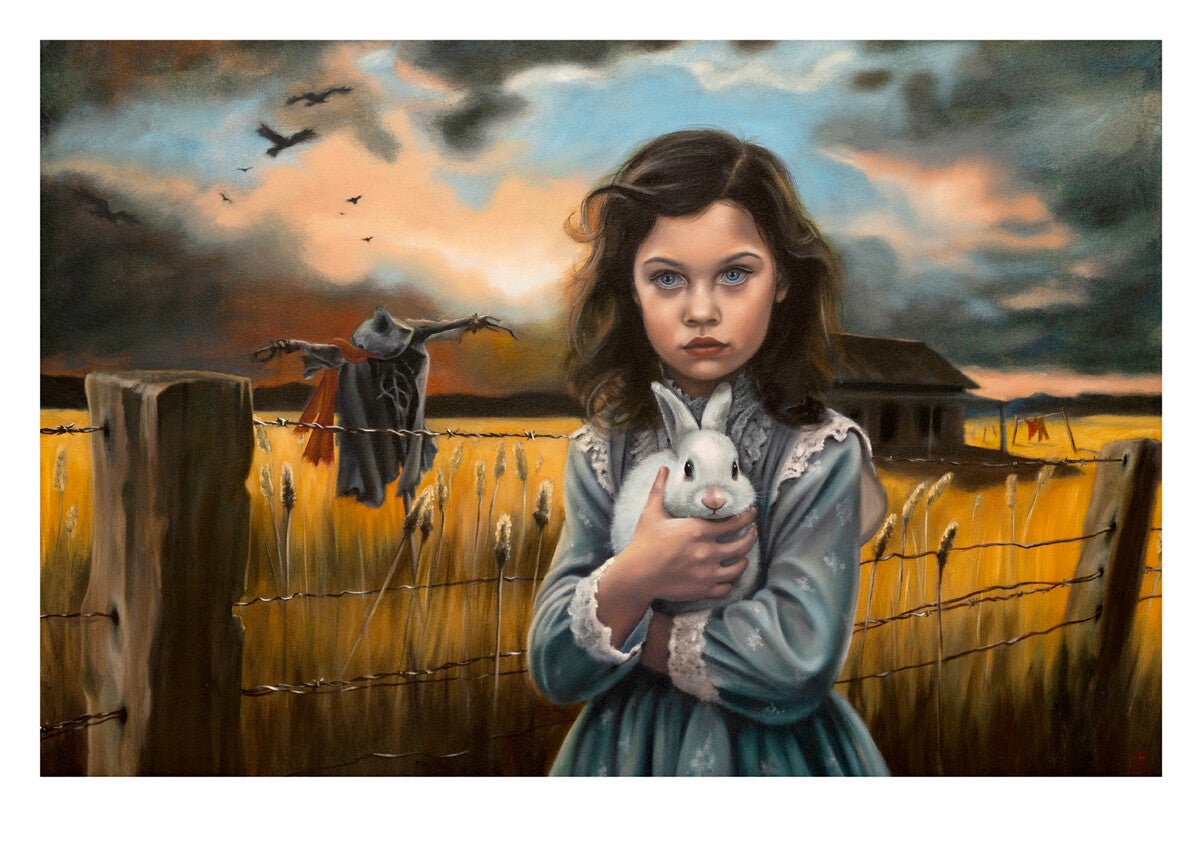 Saving Giuliano : by Josslyn Martin Art – Limited edition (100) print. This larger A2 print of Josslyn’s painting, which was initially inspired by a photograph taken by the American photographer Dorothea Lange in 1939 — specifically, an image of Chris Adolph’s younger children. When Josslyn first saw Dorothea’s photo she commented, “Something about their expressions, the setting, the rawness of it — it all struck a deep chord. It immediately brought to mind Australia’s own Depression-era struggles. Times when food was scarce and rabbits, for many, became a vital source of protein and survival.”