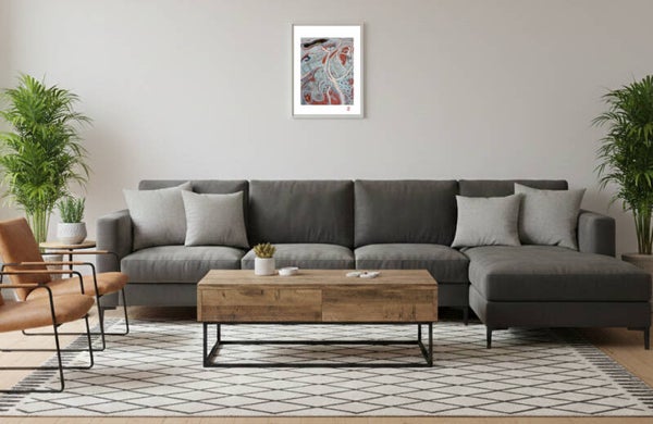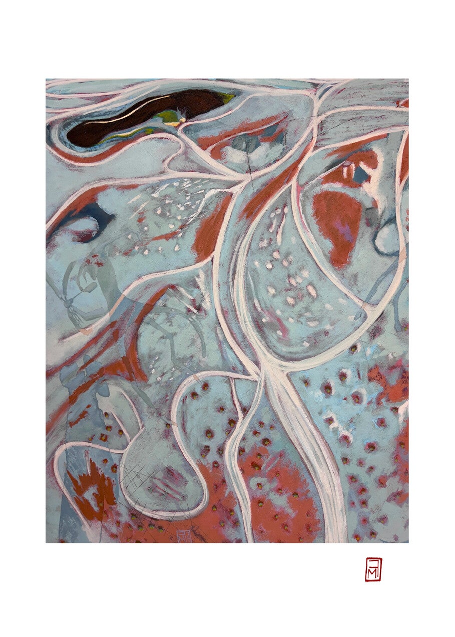 Looking BackWhile Walking Forward: by Josslyn Martin Art is a Limited edition (100) print. This painting created by Martin in the style of the Desert Painters of Western Australia was initially inspired by a photograph of the Hills Gold Mine taken in the Australian Desert. The soil was turned blue white; what was happening to the ground? I liked the abstract nature of the image, even though it was real. You see this sometimes.
