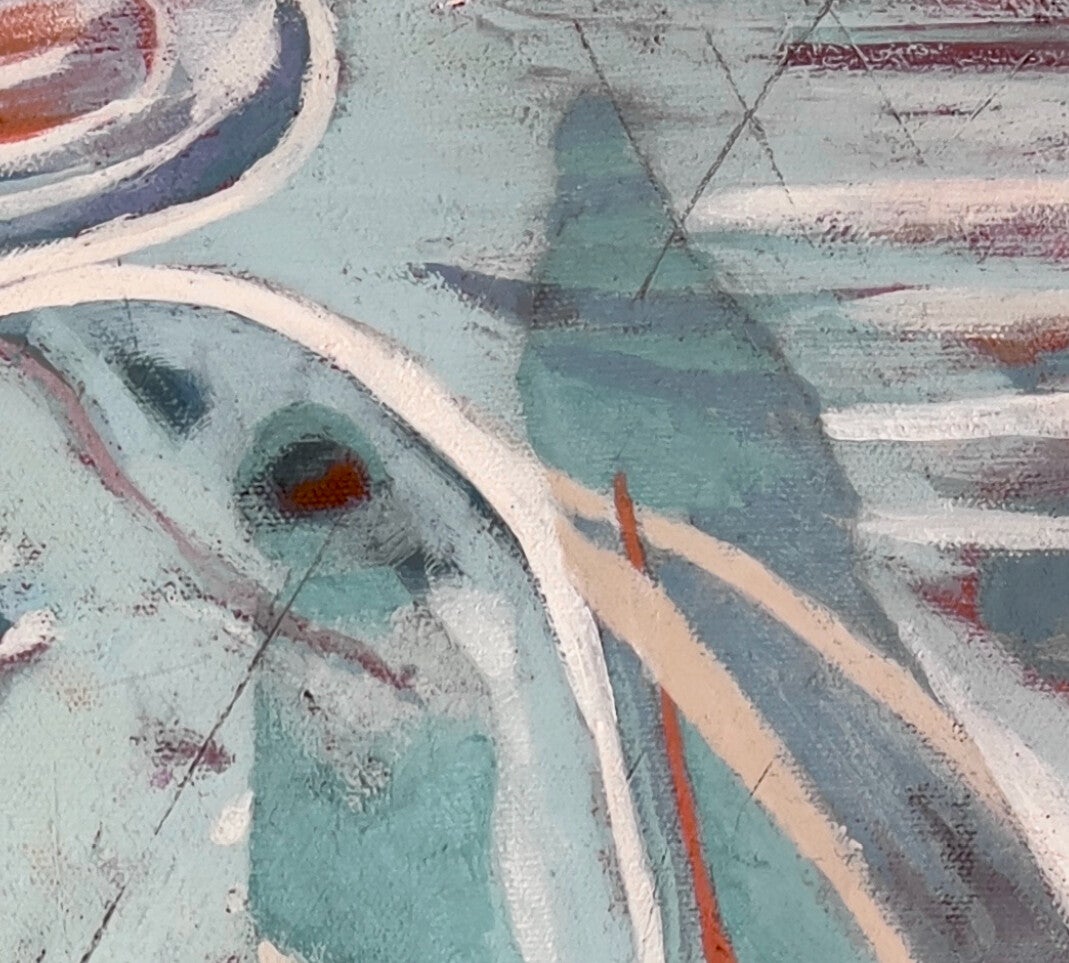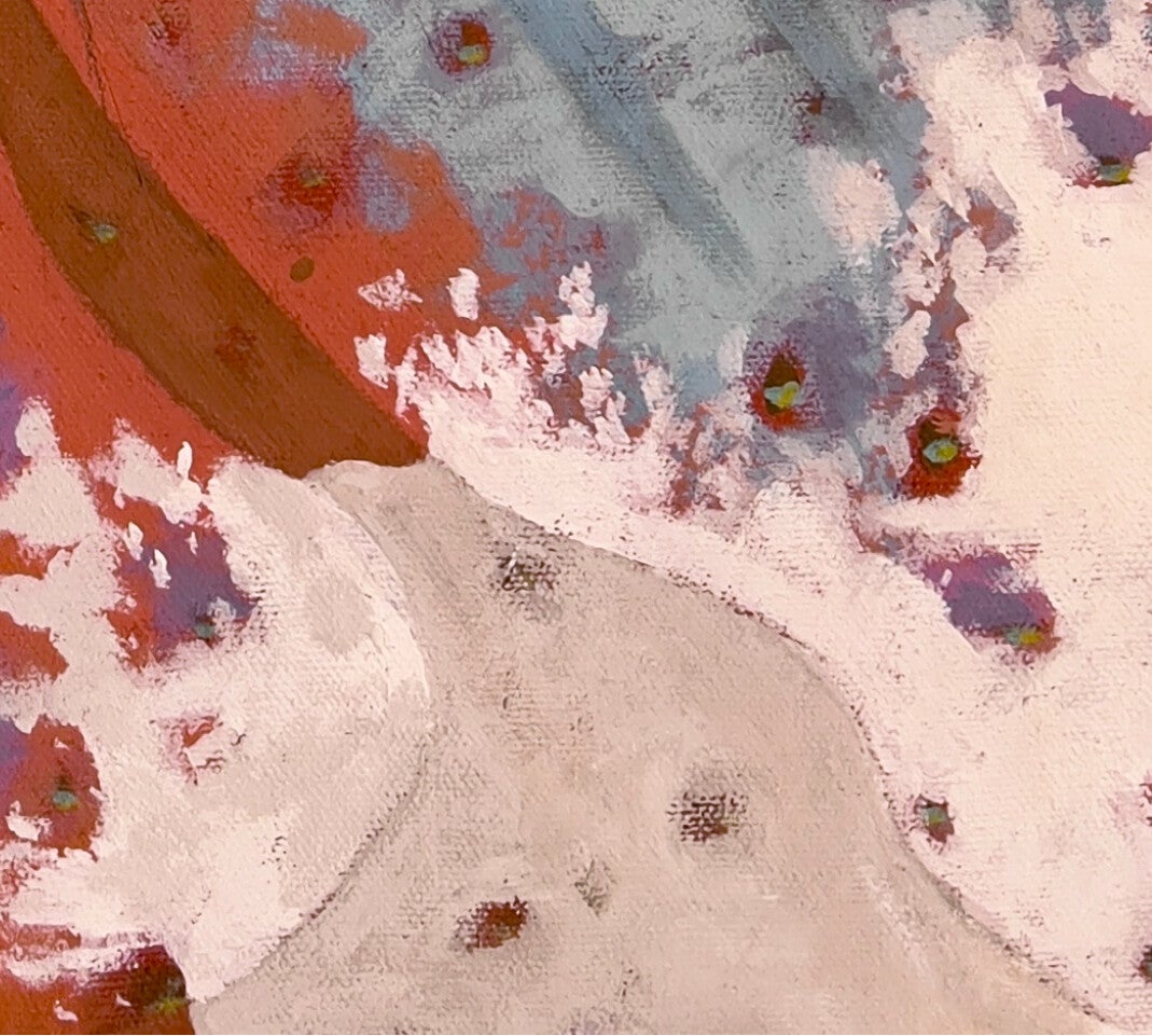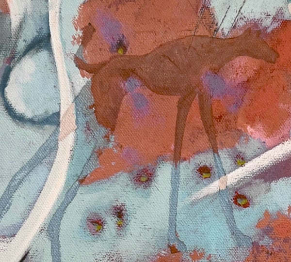 Looking BackWhile Walking Forward: by Josslyn Martin Art -Limited edition (100) print. In this print, the 2nd print from the painting, “I wanted to look at the other spirits on the canvas. Ghost is a dingo spirit, another totum that came early on in my career. He wanders the desert landscape together with another set of three human spirits (the lost souls)”. This painting, created by Martin in the style of the Desert Painters of Western Australia, was initially inspired by a photograph of the Hills Gold Mine taken in the Australian Desert. The soil was turned blue white; what was happening to the ground? I liked the abstract nature of the image, even though it was real. You see this sometimes.